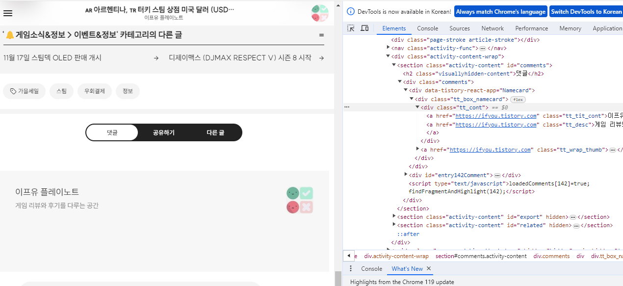 개인적인 공간/스킨수정 📇 티스토리 프로필 카드 숨기기 2023.11.23 15:57 글 작성자: ifyouys [안내] PC에서도 프로필 카드를 확인할 수 있어요. 안녕하세요. 티스토리팀입니다. 티스토리 글을 읽다보면 혼자만 보기 아까운 유용한 글들이 참 많은데요. 마음에 드는 블로그를 한 눈에 살펴보고, 주변 사람들과 더 쉽고 빠르게 공유할 수 있 notice.tistory.com 모바일 환경에서 볼 수 있었던 프로필 카드를 디자인 수정 없이 그대로 코드만 추가하였는지 지금 사용하고 있는 스킨과 어울리지도 않고 그렇다고 해서 수정해서 써보자니 방법도 모르겠고 그래서 그냥 숨기는 걸로 결정하였습니다.CSS 코드는 정상우님의 헬로 스킨 릴리즈 노트를 참고하였습니다. 갑자기 나타난 이 녀석 tt_box_namecard 🤔 CSS [CSS] 에서 아래 코드를 추가해 주세요. /* 티스토리 프로필 카드 숨기기 */ div[data-tistory-react-app="Namecard"] { display: none } 반응형 공유하기 게시글 관리 이프유 플레이노트 저작자표시 비영리 변경금지 (새창열림) '개인적인 공간 > 스킨수정' 카테고리의 다른 글 🗂️ 티스토리 카테고리 앞에 폰트어썸 아이콘 추가하기 (0) 2023.11.24 댓글 공유하기 다른 글 댓글 이 글 공유하기 구독하기 구독하기 카카오톡 카카오톡 라인 라인 트위터 트위터 Facebook Facebook 카카오스토리 카카오스토리 밴드 밴드 네이버 블로그 네이버 블로그 Pocket Pocket Evernote Evernote 다른 글 🗂️ 티스토리 카테고리 앞에 폰트어썸 아이콘 추가하기 🗂️ 티스토리 카테고리 앞에 폰트어썸 아이콘 추가하기 2023.11.24 다른 글 더 둘러보기