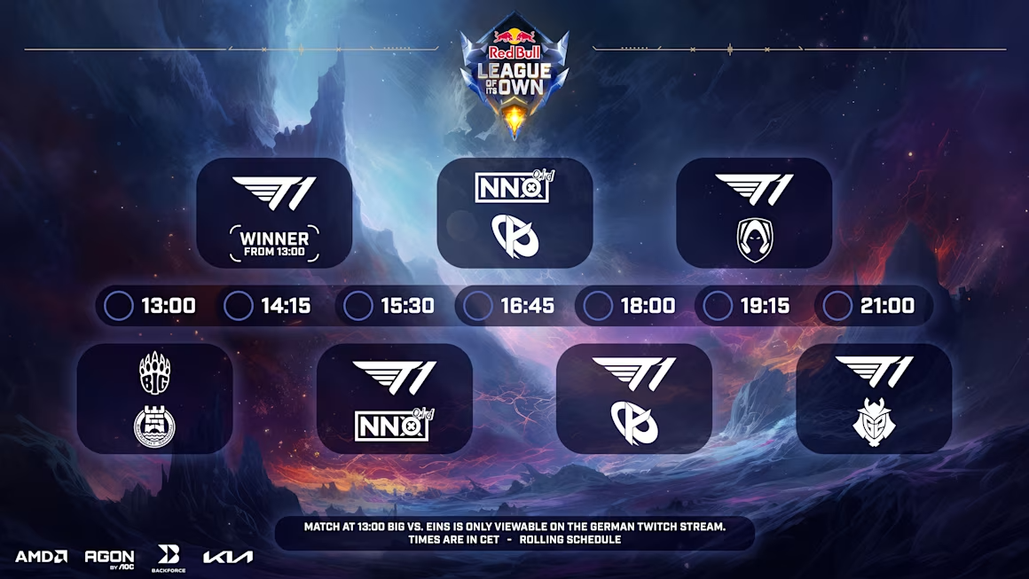 Red Bull League of Its Own is a Red Bull Gaming showmatch series matching T1 against European teams including ERL and streaming teams. Initially, the event was announced with German streamer team NNO Old (No Need Orga) and Prime League 1st Division teams B
