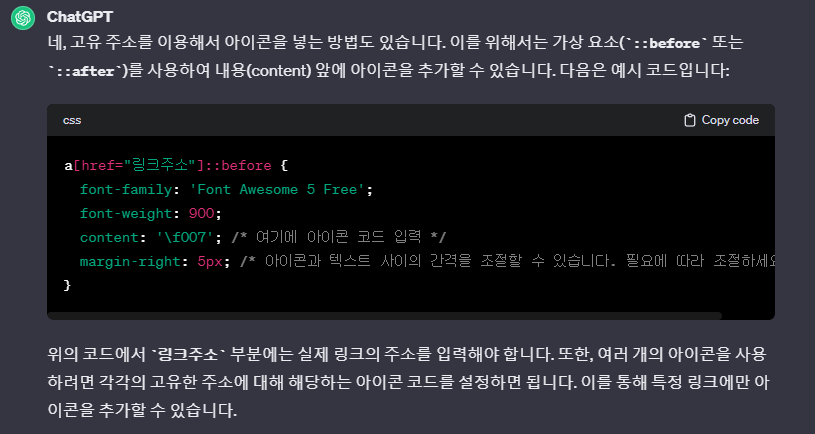 특별한건 없지만 그래도 그냥 예전부터 꼭 해보고 싶었던거라 틈만 나면 구글링을 하고 있었지만 저같은 초보가 감히 시도하기엔 너무 어려운듯 하여 포기하고 있었던 카테고리에 아이콘 넣기. 이런 저런 방법들을 다 사용해보다가 이가 없으면 잇몸으로 하자는 생각으로 고유주소를 이용하면 어떨까 싶어서 ChatGPT 를 통해 CSS 코드를 얻어 보았습니다.